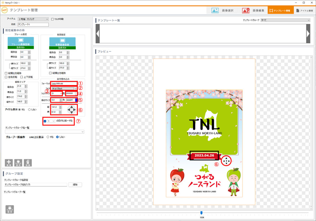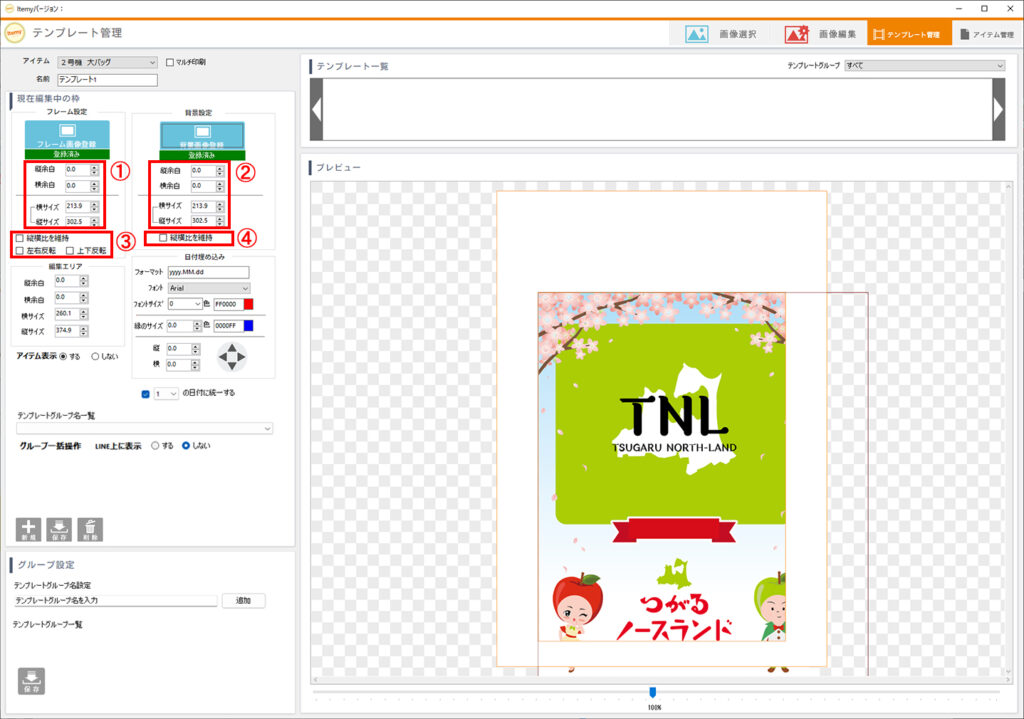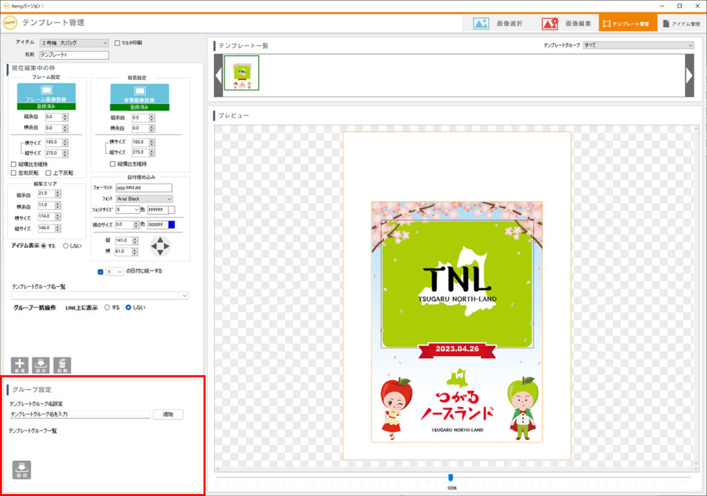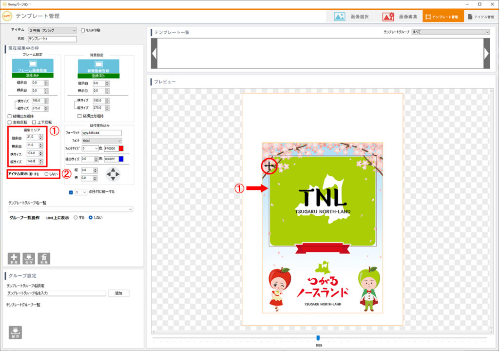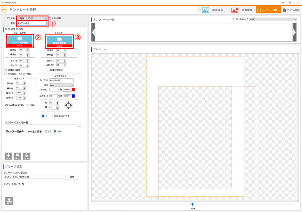 1. アイテム欄はプルダウンから「大バッグ」を選び、名前欄には任意のテンプレート名を入力します。