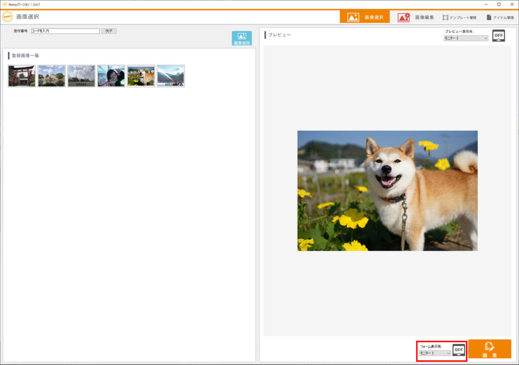 画像選択画面の右下、編集ボタンの左にあるモニターマークをクリックしてQRコードを表示します。