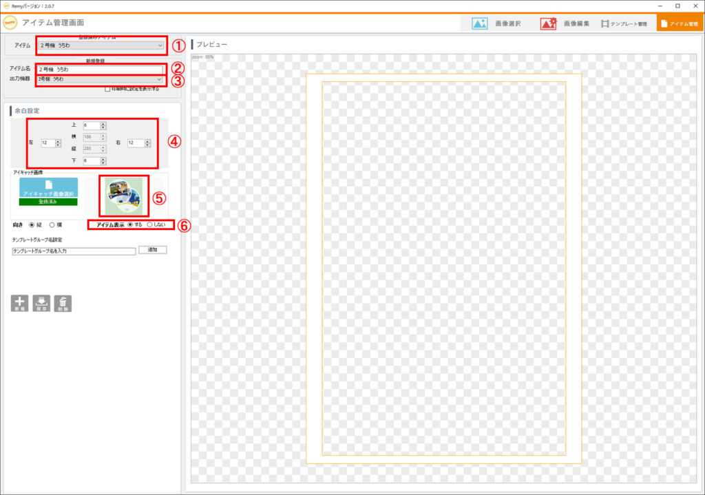 | ⑥アイテム表示 | 使用しないアイテムがある場合、アイテムを選んで、「しない」にすると非表示になります。 |