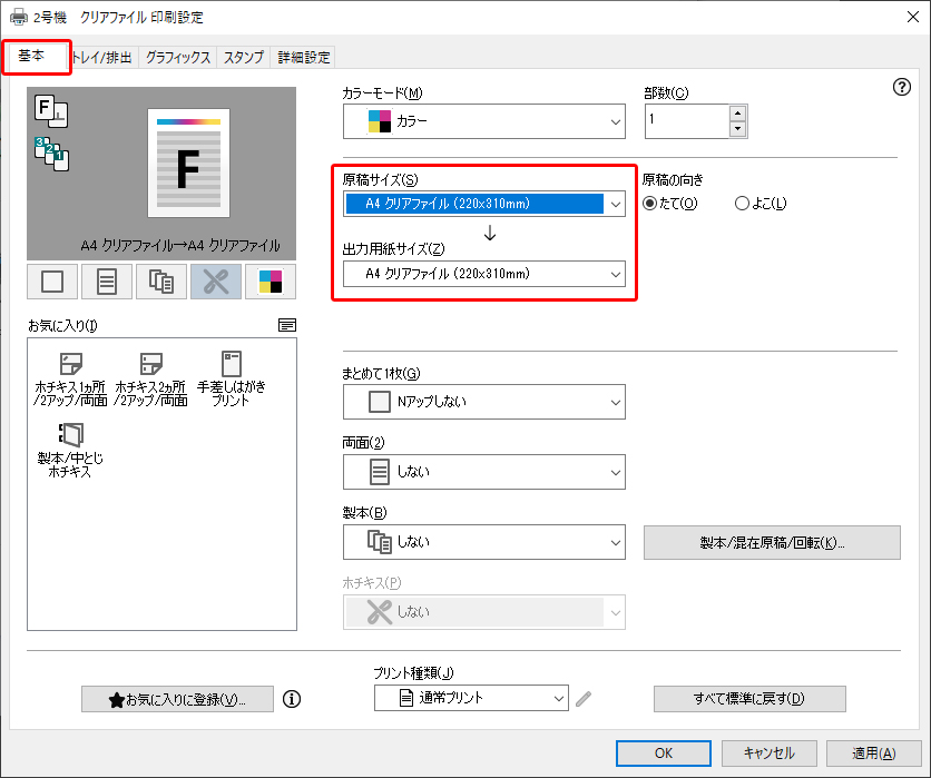「基本」タブで原稿サイズを変更できます。「原稿サイズ」と「出力用紙サイズ」を合わせます。