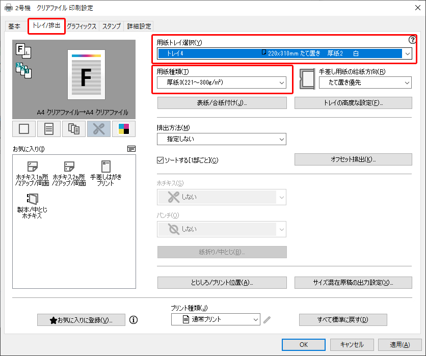 「トレイ/排出」タブで用紙トレイや用紙種類を変更できます。
