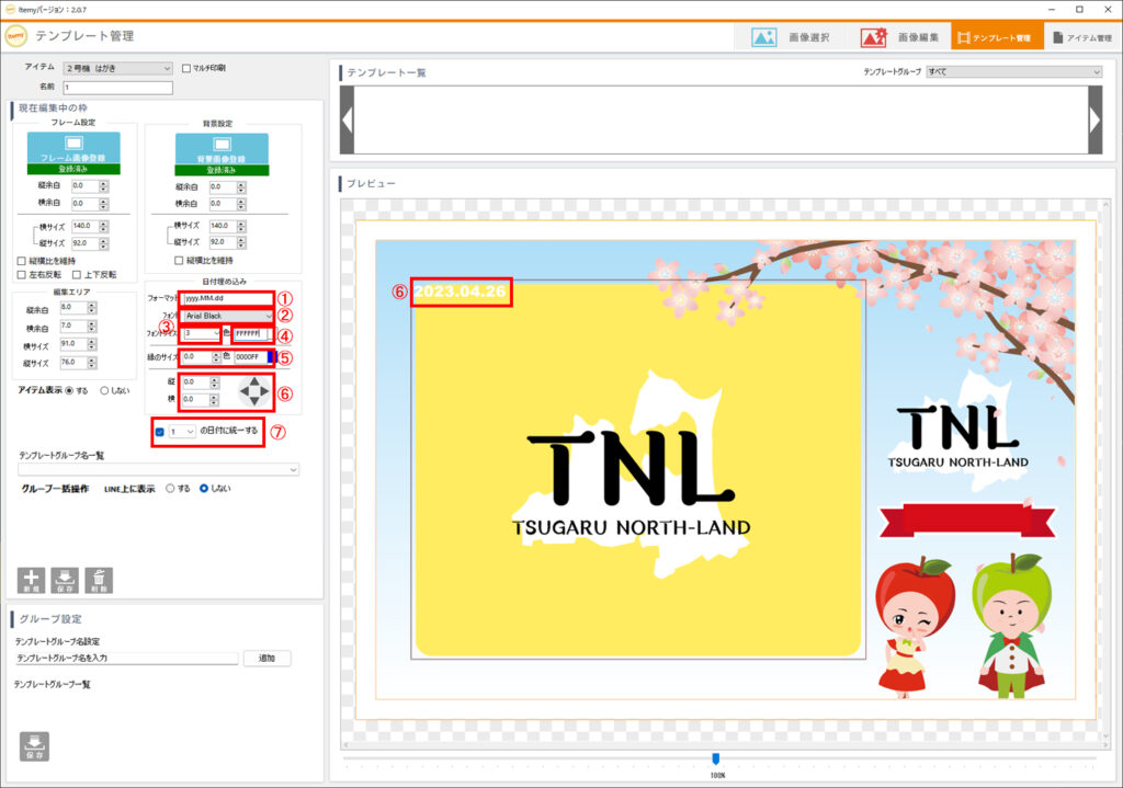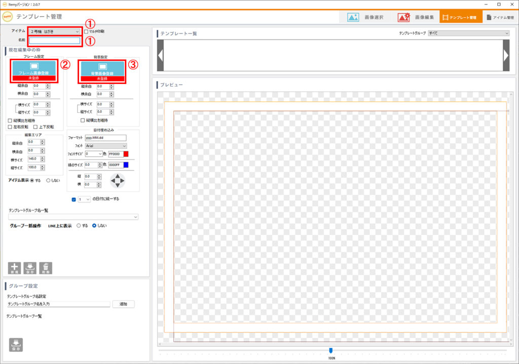 - アイテム欄はプルダウンから「フォトカード」を選び、名前欄には任意のテンプレート名を入力します。