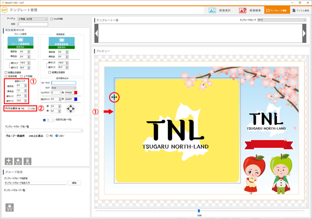 なるべく余白がないようにフレームの限界まで調整します。 - テンプレートをLINEに表示・非表示させるかの設定ができます。