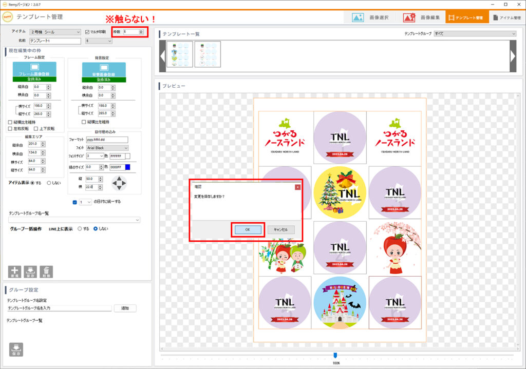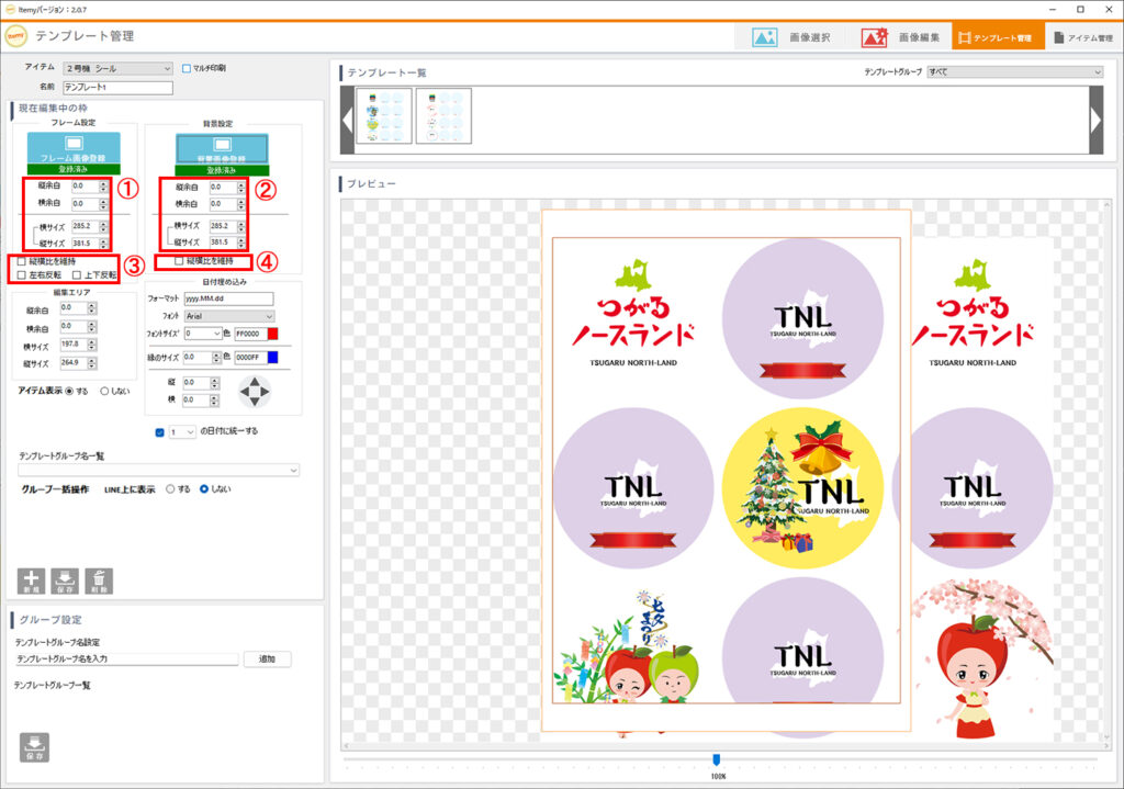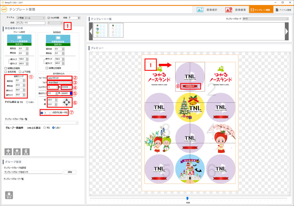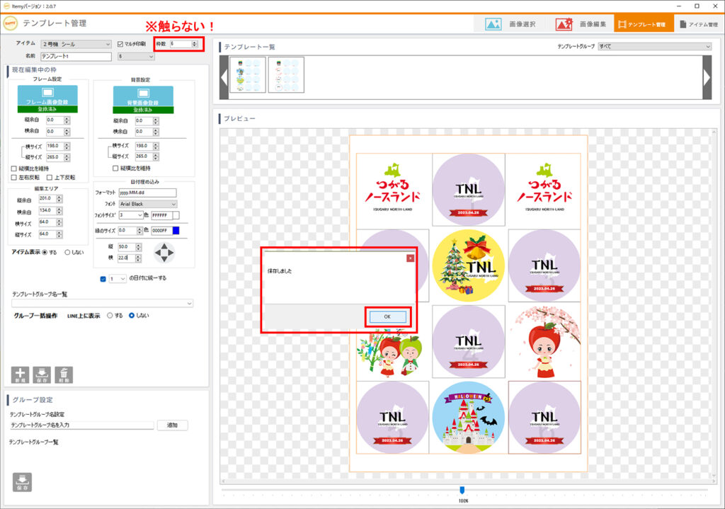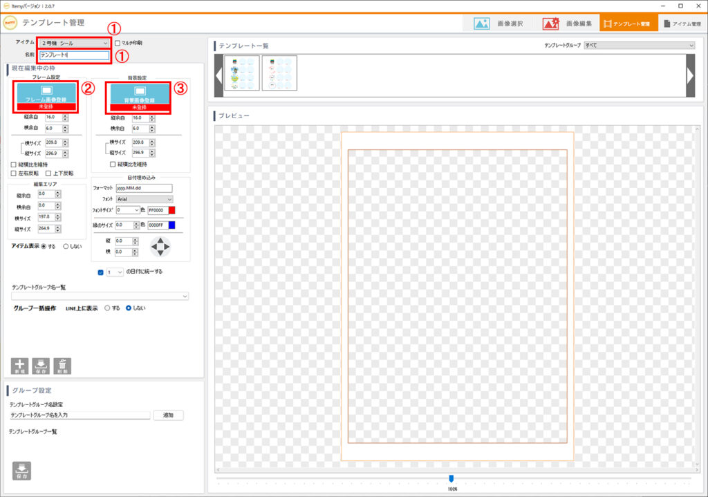 - アイテム欄はプルダウンから「シール」を選び、名前欄には任意のテンプレート名を入力します。