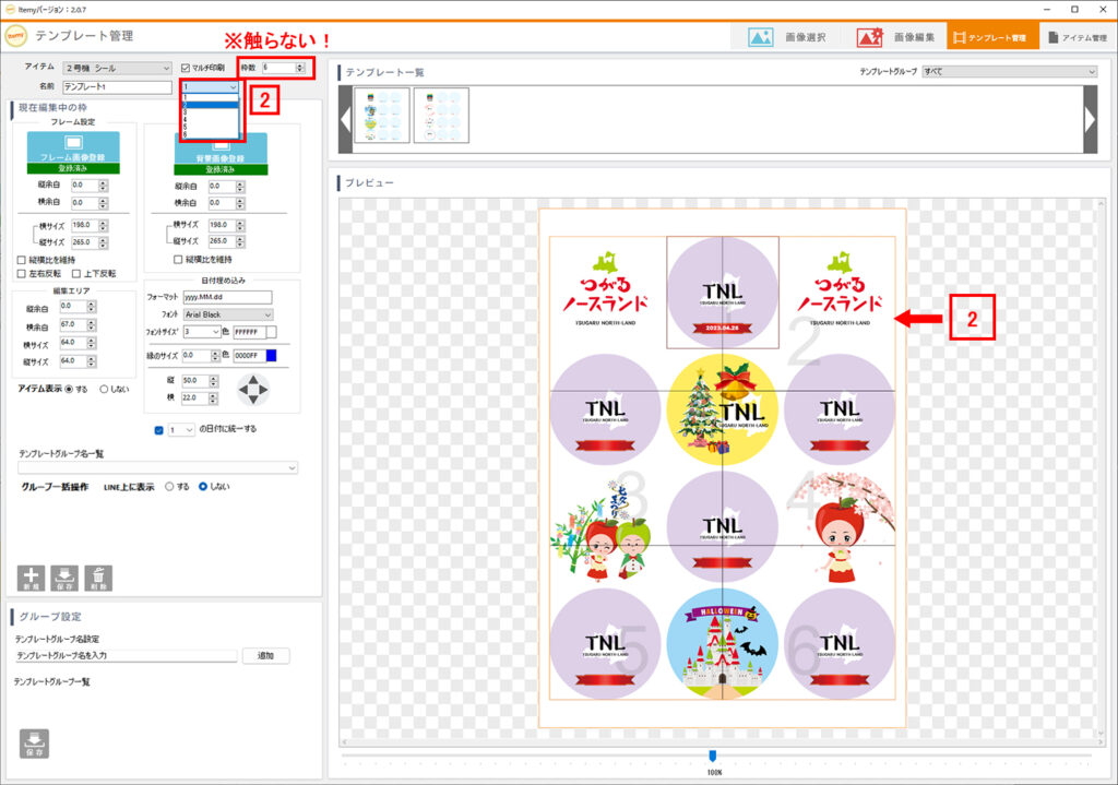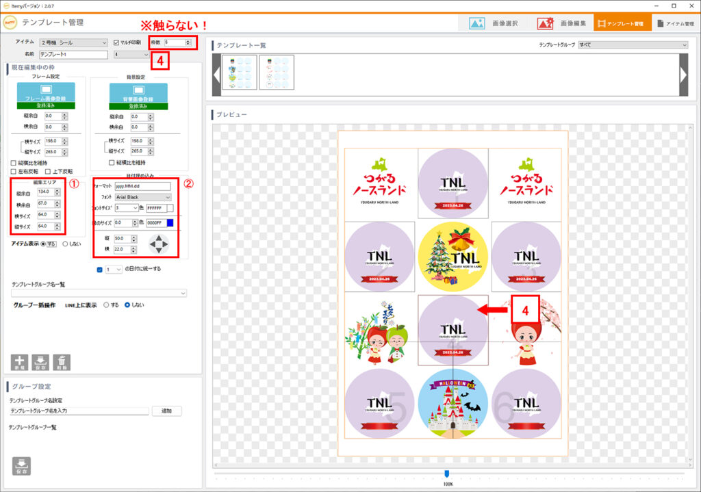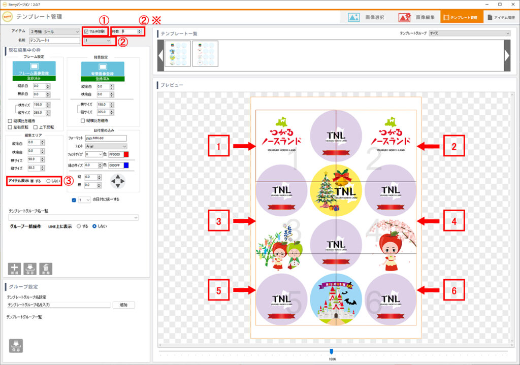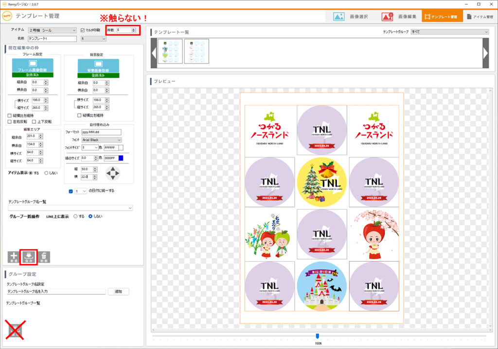 ※枠数が決まったら触らないようにします。余白、サイズがリセットされます。 - テンプレートをLINEに表示・非表示させるかの設定ができます。